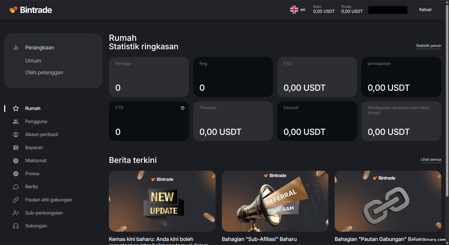 - Komisen seumur hidup per klien. Atribusi rujukan di BinTrade tiada tarikh luput. RevShare seumur hidup ialah kelebihan besar — bawa pedagang sekali, dan walaupun mereka kembali setahun kemudian untuk berdagang lagi, anda masih dibayar. Tiada had seperti “kami bayar hanya untuk 6 bulan pertama aktiviti klien” — sesetengah rangkaian CPA berbuat demikian, tetapi tidak di sini. Setiap rujukan ialah “aset” yang boleh menjana dividen untuk tempoh panjang.