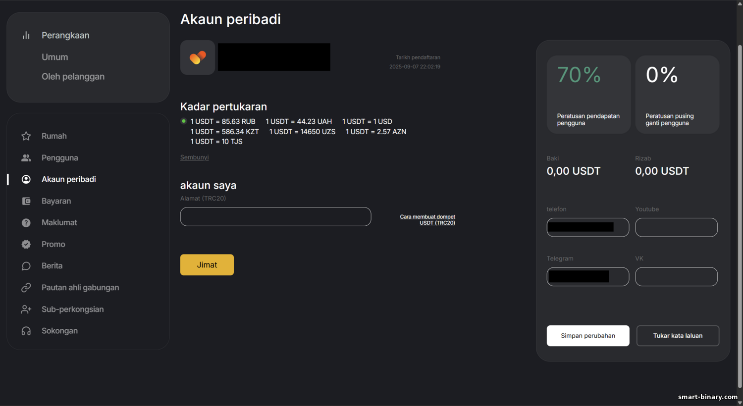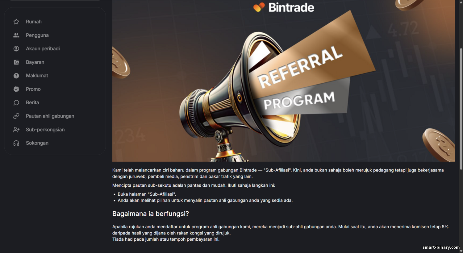 Pendapatan seumur hidup daripada setiap klien. Titik penting ialah rujukan diikat kekal kepada rakan kongsi. BinTrade mengiklankan bayaran seumur hidup: setiap pedagang dirujuk boleh menjana pendapatan kepada anda selagi mereka berdagang, tanpa had masa dalaman. Sama ada klien berdagang sebulan, setahun, atau lima tahun, anda menerima bahagian sepanjang tempoh itu. Secara praktikal, ini bermaksud program BinTrade boleh menjadi sumber pendapatan pasif jangka panjang. Sudah tentu, jangka hayat pedagang di platform bergantung pada banyak faktor (hasil peribadi, kepuasan platform, dll.), tetapi tiada had masa di pihak afiliasi. Ini kelebihan besar berbanding CPA: bukannya bayaran sekali, anda membina “dana pencen” daripada banyak transaksi kecil yang terkumpul menjadi jumlah material.