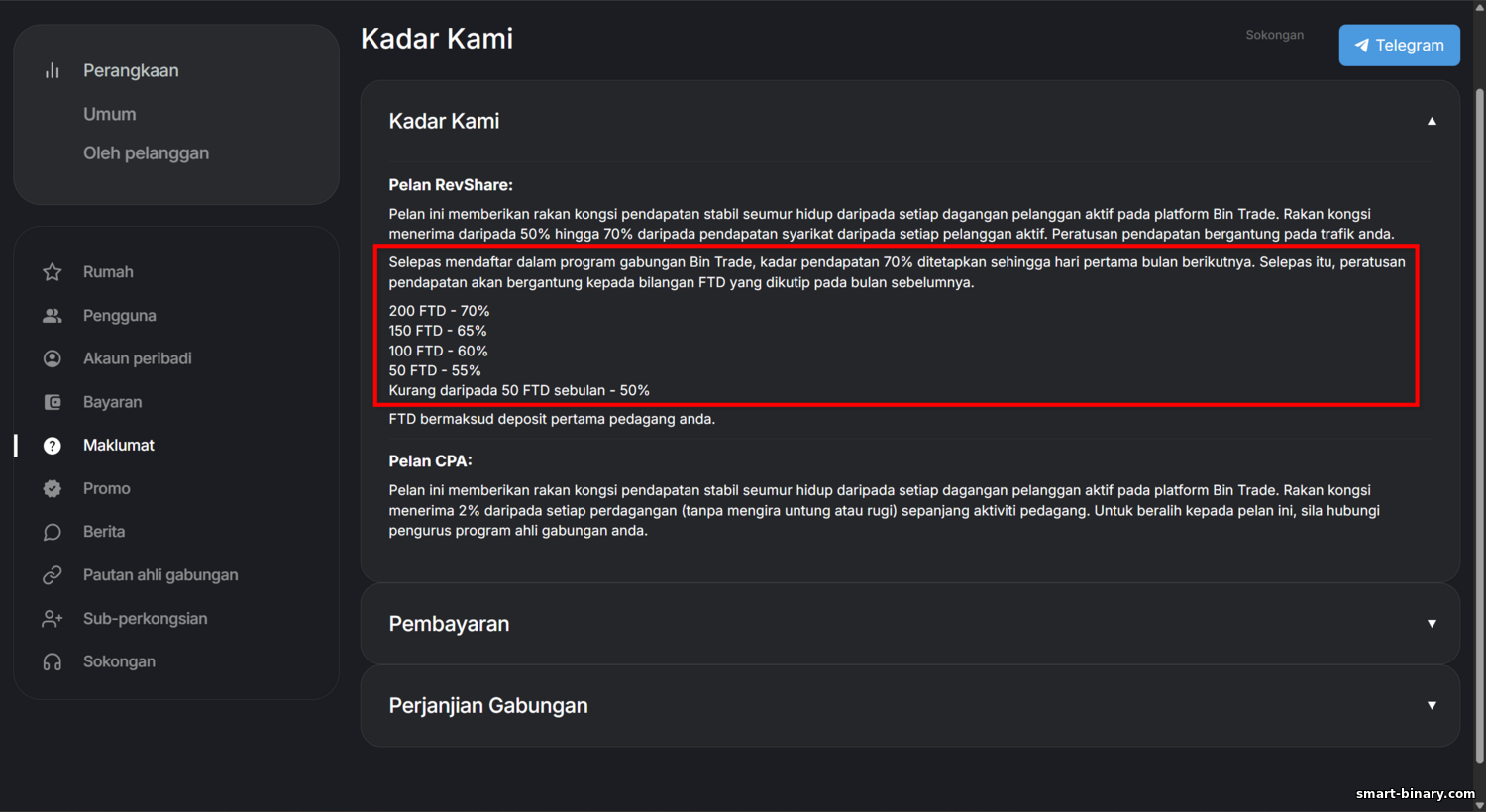 Berapa peratus yang diperoleh rakan kongsi? BinTradeClub menjalankan model RevShare yang membayar dari 50% hingga 70% daripada keuntungan broker daripada pedagang. Ringkasnya, separuh atau lebih daripada pendapatan syarikat daripada klien yang anda bawa dipulangkan kepada anda sebagai komisen. Had atas — 70% — tinggi mengikut piawaian pasaran, setanding tawaran teratas. Sesetengah bahan promo broker malah menyebut sehingga 80% seumur hidup, namun angka yang disahkan secara bebas menunjukkan julat 50–70%. Berkemungkinan rakan kongsi baharu bermula hampir 50%, manakala 70% dikhususkan untuk rakan kongsi teratas yang menghantar trafik berkualiti dalam jumlah besar (lebih lanjut di bawah).
