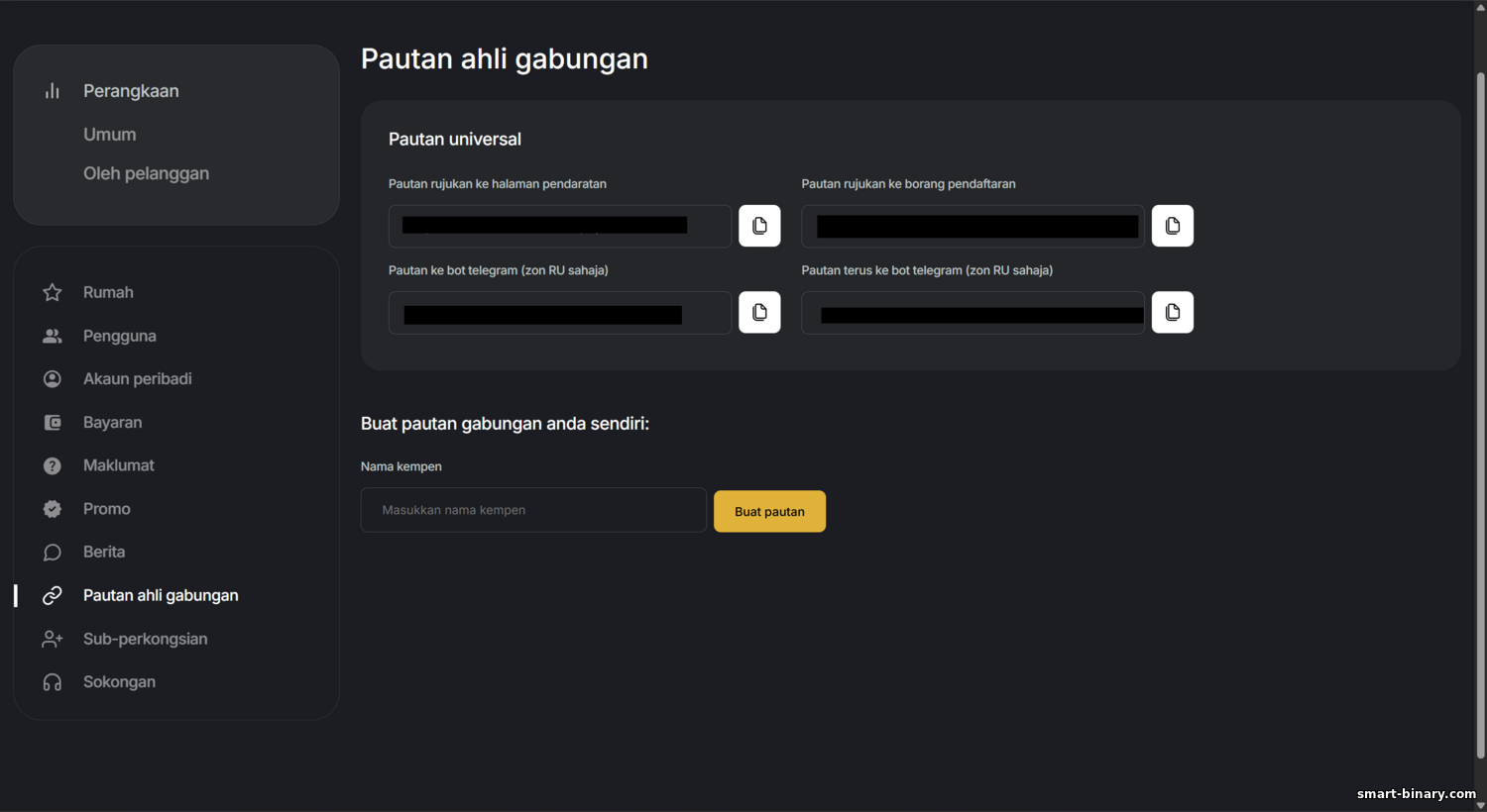 - Langkah 3. Dapatkan pautan rujukan dan bahan. Sebaik dalam papan pemuka, jana pautan rujukan unik anda. Ia biasanya muncul di halaman utama — sesuatu seperti https://bintradeclub.ru?ref=ID_anda. Semua yang klik pautan ini dan mendaftar akan diikat kepada anda. Jika program membenarkan anda cipta pautan tambahan (sub‑ID), gunakannya untuk saluran berbeza. Lawati bahagian “Promo” untuk mencari banner pelbagai saiz untuk dimuat turun atau salin kod. Mungkin juga ada halaman pendaratan siap — semak dan pilih yang sesuai dengan trafik anda. Untuk audiens berbahasa Inggeris, pastikan menggunakan kreatif Inggeris (laman BinTrade tersedia sekurang‑kurangnya dalam bahasa Rusia dan Inggeris). Salin pautan dan kod banner — anda akan memerlukannya selepas ini.