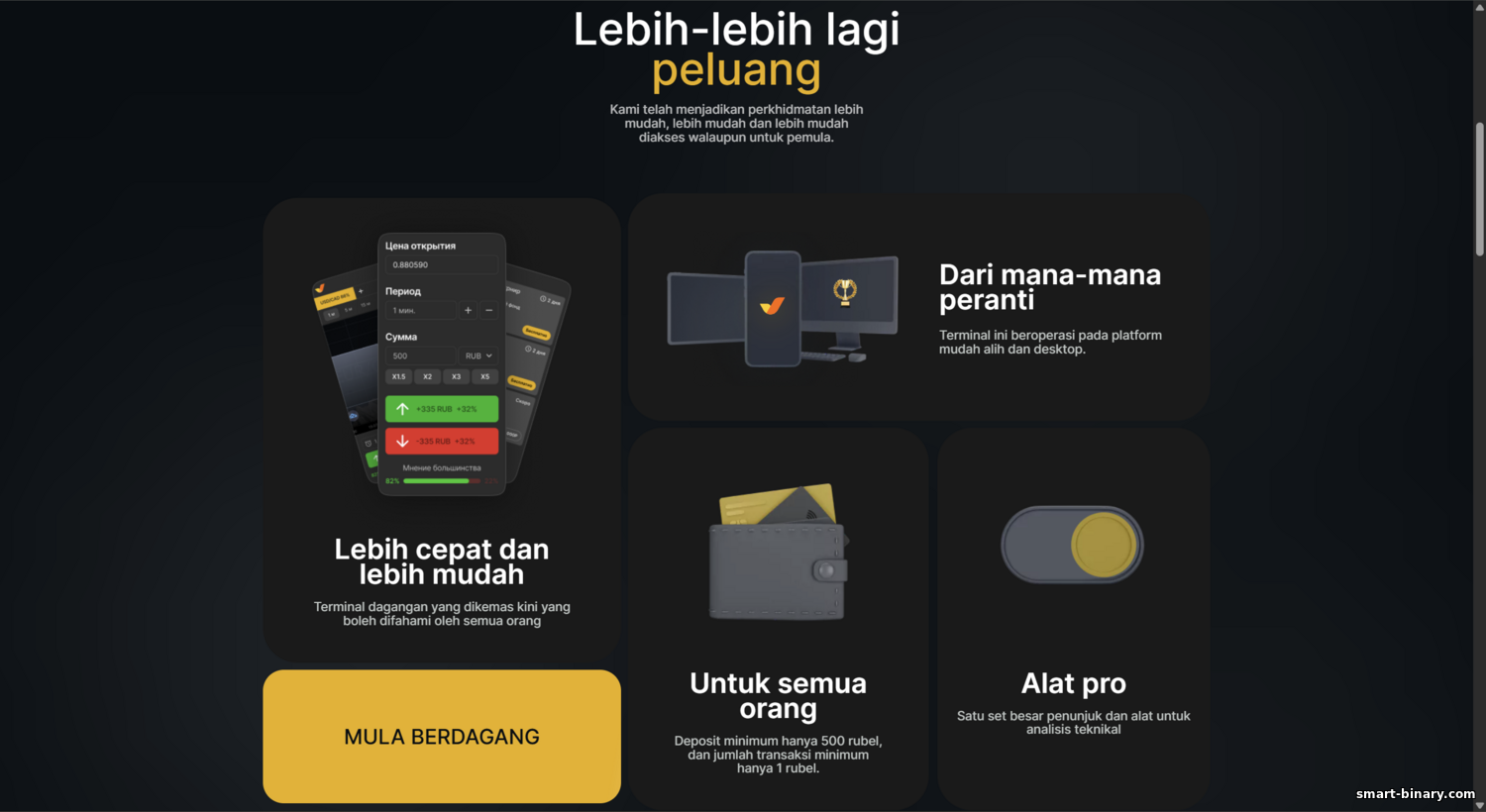Adaptasi mudah alih nampak kukuh. Pedagang menyatakan anda boleh meletakkan dagangan dari telefon pintar tanpa batasan: antara muka dioptimumkan untuk skrin kecil, dengan semua butang dan carta teras tersedia. Bahan pembelajaran turut ada: laman menawarkan webinar, ebook, glosari, dan analitik harian. Untuk pemula ini berguna, walaupun tiada panduan menggantikan pengalaman dan kawalan risiko yang waras.