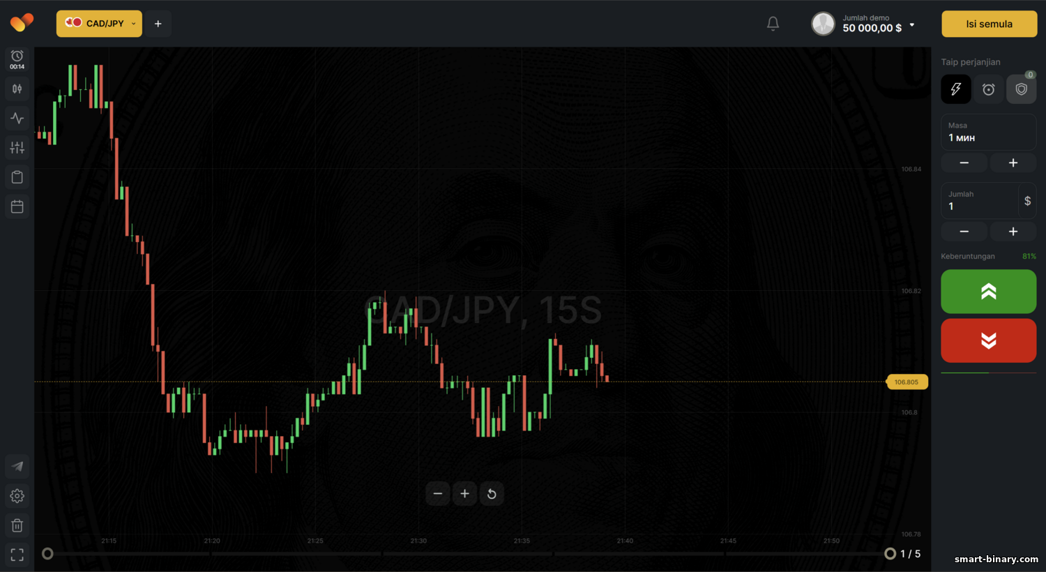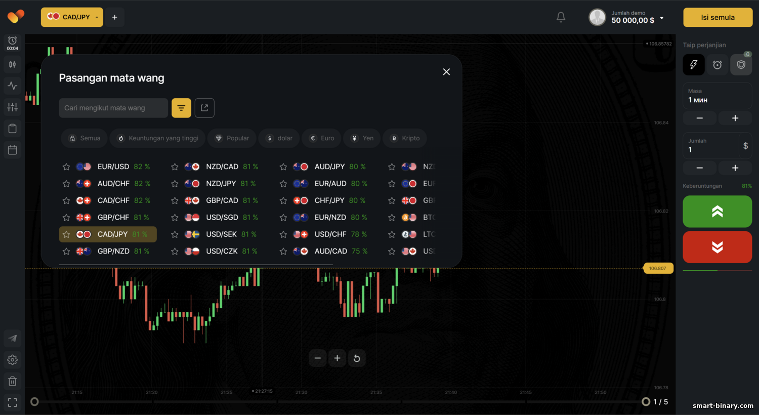 Sukar mengesahkan semuanya tanpa mendaftar — tetamu melihat maklumat terhad. Akaun demo tersedia serta-merta dan percuma, membolehkan anda menguji antara muka. Berdasarkan ulasan, platform memang mempunyai fungsi standard opsyen binari: memilih aset, menetapkan tempoh luput, jumlah dagangan, dan butang Naik/Turun. Dagangan dilakukan dengan satu klik, dan pelaksanaan pesanan diiklankan sebagai segera (tanpa gelinciran).