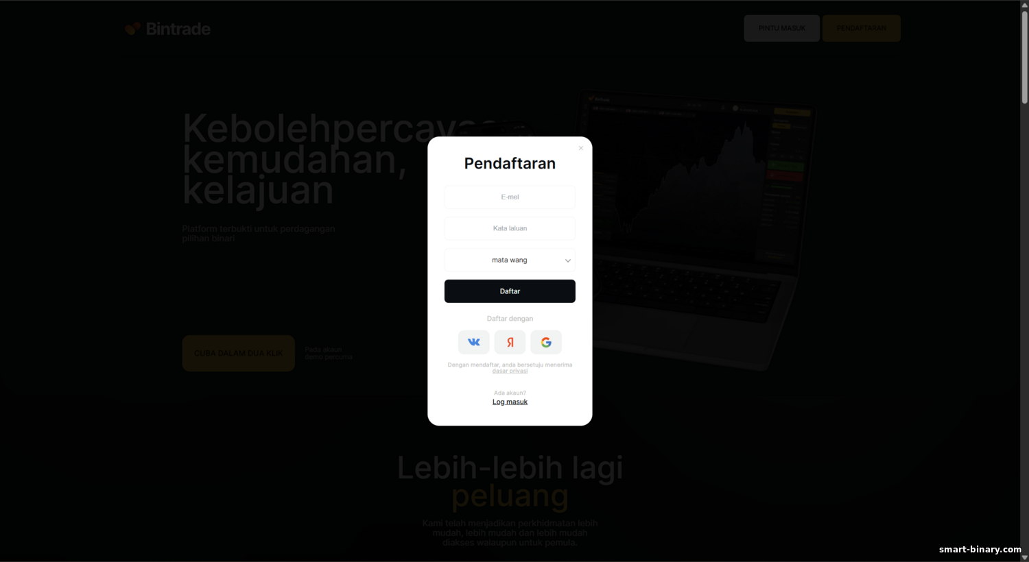 BinTrade mula beroperasi sekitar 2020. Syarikat ini memposisikan dirinya sebagai platform dagangan opsyen binari yang membolehkan anda meraih keuntungan daripada pergerakan harga pelbagai aset. Laman rasmi (dahulu bintradeclub.ru dan beberapa domain lain) menyasar pedagang berbahasa Rusia. Pemasaran BinTrade menjanjikan pulangan sehingga 90% bagi satu dagangan, pembayaran segera, dan terminal yang mudah dengan banyak indikator. Tuntutan sebegini memang kedengaran memikat: siapa yang tidak mahu memperoleh hampir separuh lebih daripada modal dalam beberapa minit?