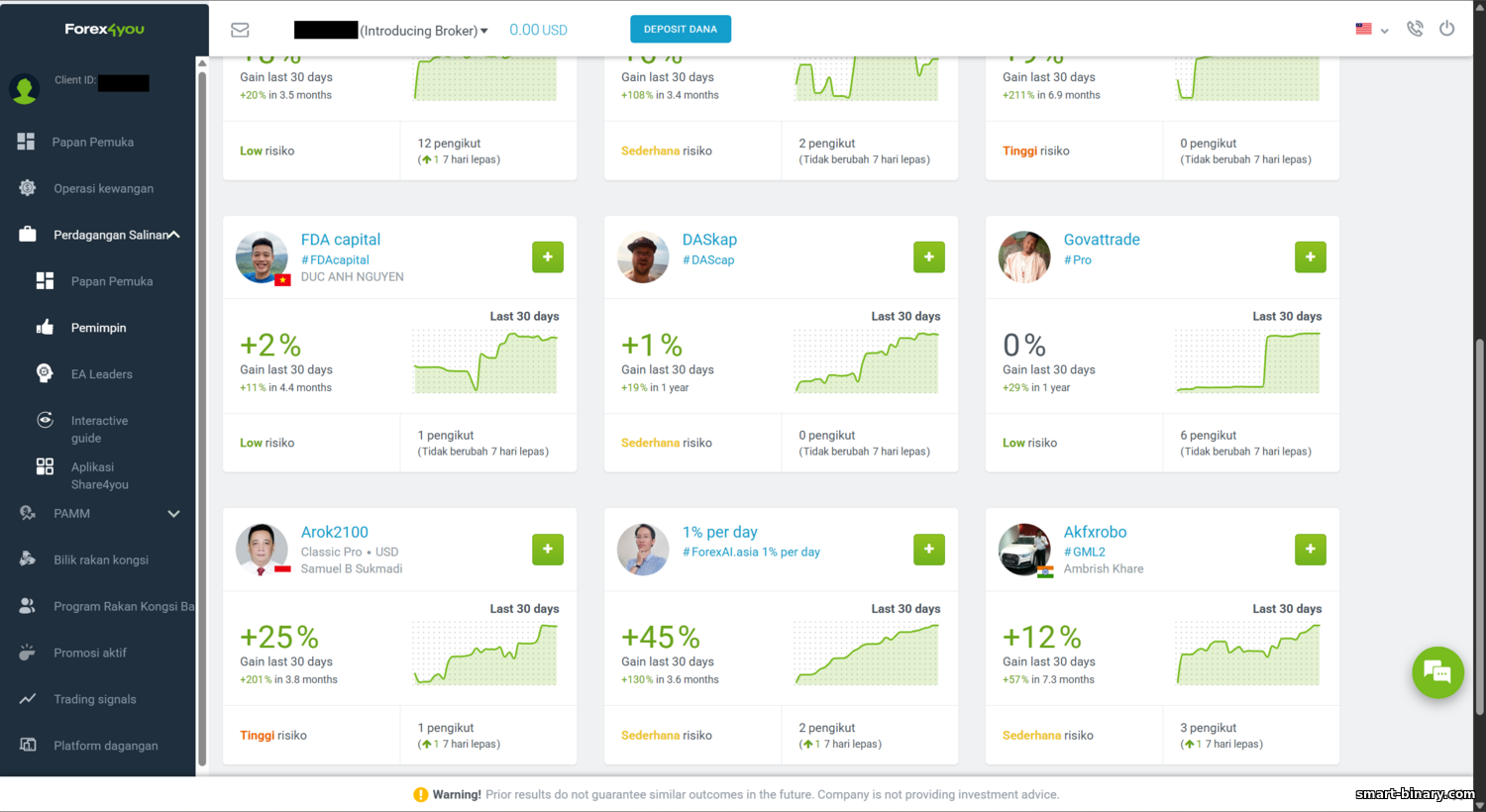 Ini ialah perkhidmatan utama Forex4you yang dilancarkan pada 2013. Cara ia berfungsi: pedagang berpengalaman mendaftar sebagai Leader dan memautkan akaun dagangan live ke Share4you. Mereka terus berdagang seperti biasa, dan dagangan mereka dihantar ke sistem Share4you. Pendatang baharu atau pelabur mendaftar sebagai Subscriber dan memilih satu atau lebih Leader dari senarai. Apabila Leader membuka dagangan, posisi setara dibuka pada akaun Subscriber (secara berkadar dengan baki atau faktor pilihan). Dengan cara itu, walaupun tanpa pengalaman, klien boleh meniru pedagang yang menguntungkan dan berpotensi menjana pendapatan dengan mengikut mereka. Leader dibayar untuk lot yang disalin. Leader menetapkan fi — contohnya, $4 atau $8 per lot. Fi dibayar oleh broker daripada spread atau melalui komisen tambahan Subscriber (bergantung pada pelan). Ringkasnya, Share4you ialah salinan dagangan klasik yang menjadikan dagangan lebih mudah diakses.