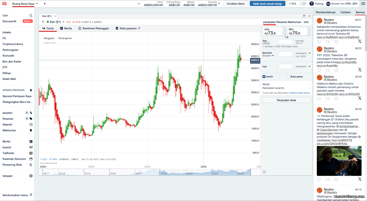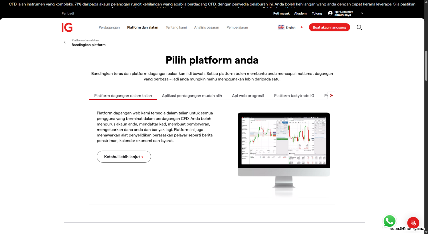 Apakah yang IG terkenal dan apa yang ditawarkannya? IG mempelopori spread betting kewangan — pada 1970-an ia membolehkan klien membuat spekulasi pergerakan harga emas ketika pemilikan logam itu terhad. Hari ini IG ialah broker dalam talian berbilang aset. Rangkaian produknya merangkumi Forex dan CFD merentasi semua kelas aset utama (mata wang, saham, indeks, komoditi, kripto, dll.), akses kepada saham dan ETF sebenar untuk negara tertentu, opsyen, serta instrumen inovatif dalaman. Contohnya, IG mencipta Turbo24 — waran turbo pertama di dunia yang didagangkan di bursa, tersedia 24 jam, 5 hari seminggu. Turbo24 membolehkan pedagang Eropah menetapkan knockout (penghalang) yang mengehadkan risiko dan secara efektif menentukan leveraj. IG turut menawarkan opsyen vanila dan penghalang pada FX, indeks dan komoditi — tersedia untuk klien di beberapa negara Eropah. Di UK dan Ireland, IG secara tradisi menyediakan spread betting — cara spekulasi yang cekap dari segi cukai dan popular di kalangan pedagang UK.