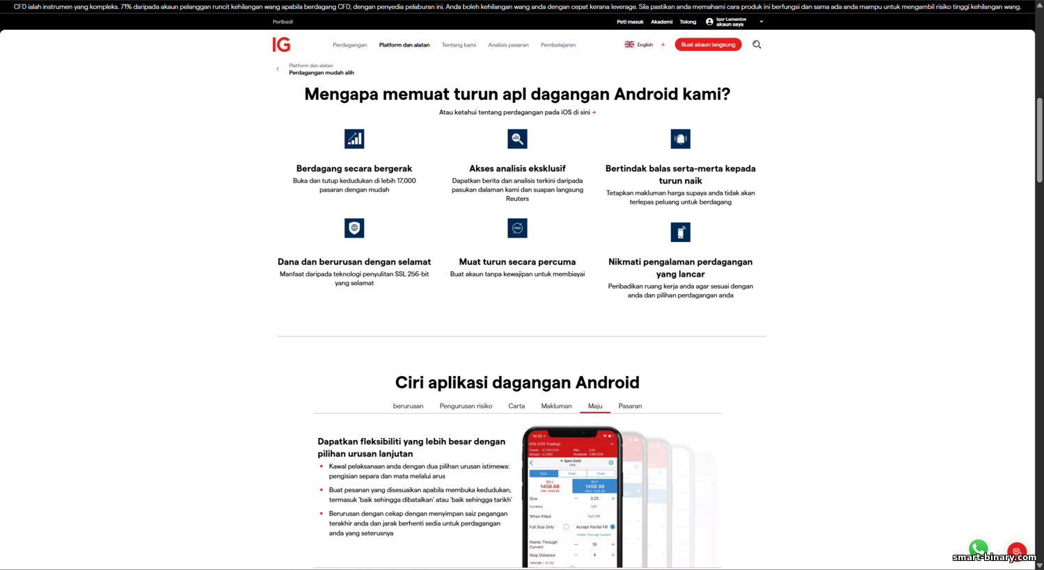 Bayangkan broker yang telah beroperasi lebih 40 tahun dan menawarkan ribuan instrumen di seluruh dunia. Itulah IG (IG Markets) — perintis dagangan dalam talian dan antara penyedia CFD serta forex terbesar di dunia. Syarikat ini diasaskan pada 1974 di UK oleh ahli kewangan terkenal Stuart Wheeler dan pada asalnya dikenali sebagai IG Index. Sejak itu, IG berkembang pesat: ibu pejabat di London dan pejabat di lima benua (jumlah 14 pejabat global). IG Group — syarikat induk broker — didagangkan secara terbuka di London Stock Exchange dan termasuk dalam FTSE 250. Ini bermakna broker kerap menerbitkan penyata kewangan diaudit, yang menambah kredibilitinya.