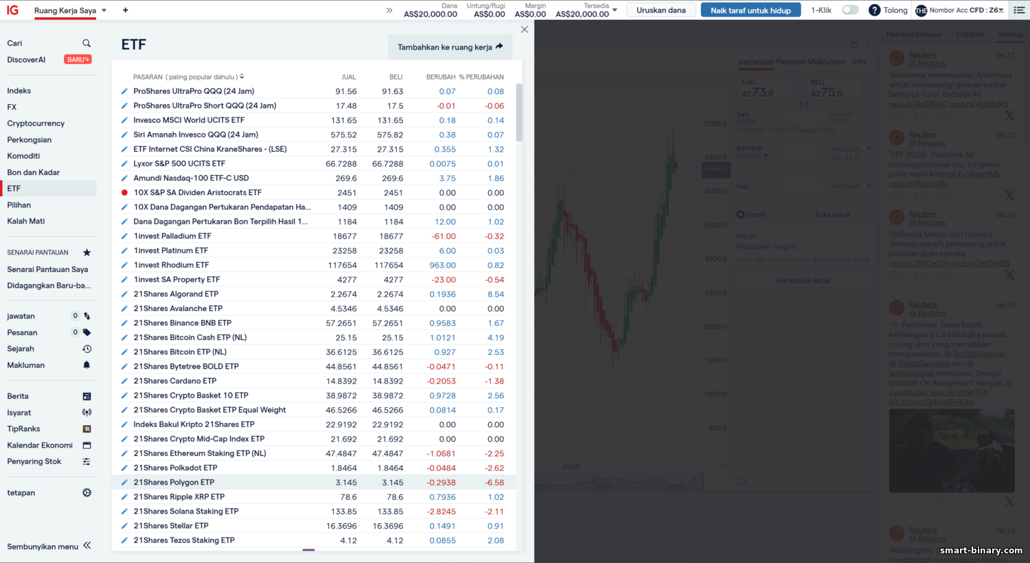 - ETF tersedia sebagai CFD (~5,400 dana) dan, di sesetengah wilayah, untuk pembelian langsung. Smart Portfolios IG di UK melabur dalam ETF iShares sebenar. Pedagang kendiri global lazimnya menggunakan ETF-CFD untuk pendedahan jangka pendek.