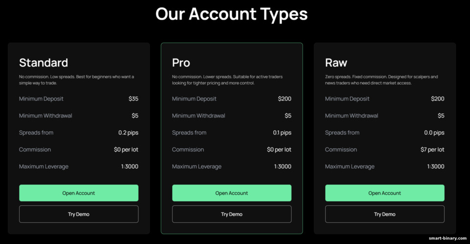 - Akaun Pro. Akaun Pro direka untuk pedagang lebih aktif yang mahukan spread lebih ketat sambil mengekalkan komisen pada sifar. Dalam syarat Pro, spread bermula dari 0.1 mata. Dalam amalan, spread Pro sering 20–30% lebih rendah berbanding Standard, terutama pada instrumen utama. Komisen ialah $0 (seperti Standard). Deposit minimum yang disyorkan bermula dari $500, menunjukkan Pro disasarkan kepada pedagang dengan modal yang lebih besar. Leveraj juga hingga 1:3000. Pro sesuai untuk dagangan intrahari dan scalping, di mana pengurangan kecil pada spread boleh meningkatkan hasil bersih. Pedagang yang menggunakan strategi sensitif spread (dagangan berita, kemasukan kerap) mungkin menghargai harga Pro.