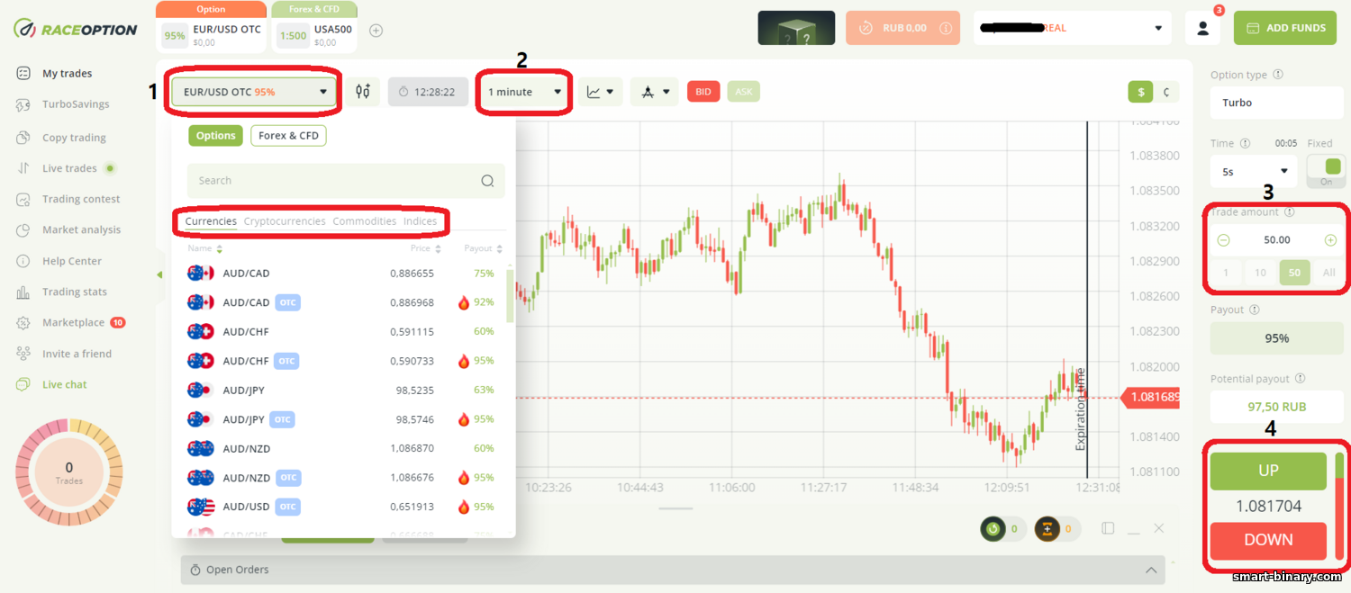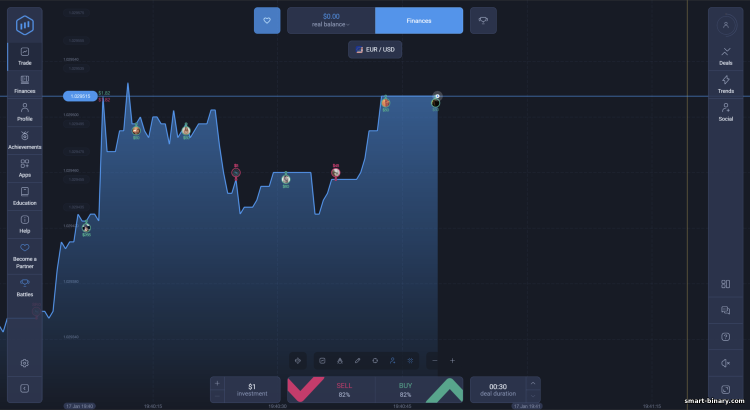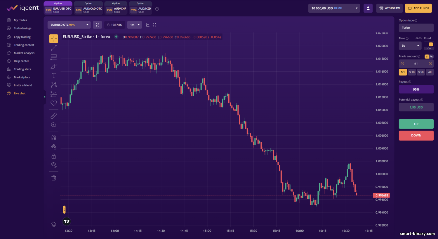 - Deposit minimum dan taruhan minimum? — Untuk membuka akaun, memadai mendeposit $10, dan amaun dagangan minimum ialah $1. Parameter ini standard dan membolehkan anda bermula dengan baki kecil. Mata wang akaun boleh jadi USD atau EUR, bergantung pada pilihan semasa pendaftaran.