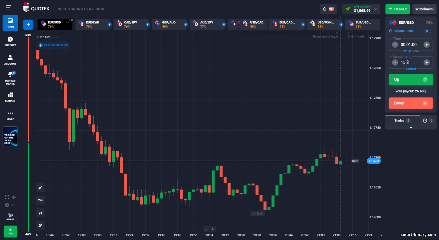 - Apakah deposit minimum dan saiz dagangan minimum di Quotex? — Anda boleh mula berdagang dengan hanya $10 dalam akaun. Taruhan minimum hanya $1. Ambang kemasukan yang rendah ini membolehkan anda menguji platform dagangan dan meningkatkan baki secara beransur-ansur tanpa risiko besar.